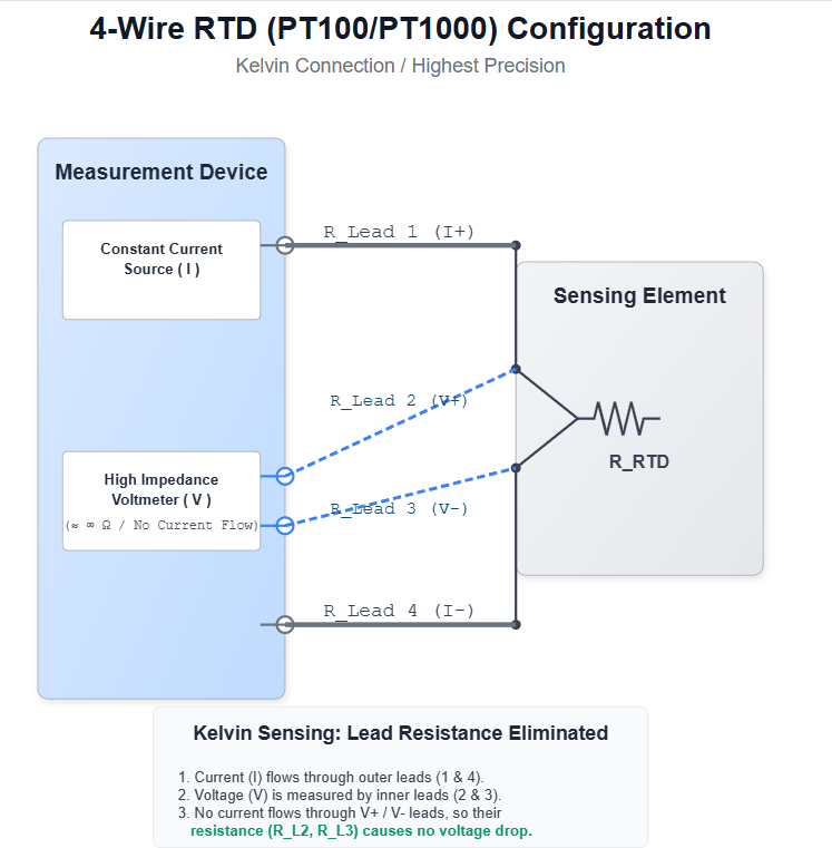 Diagram (4 wire RTD PT100 / PT1000, Kelvin connection): shows highest-precision temperature measurement with lead-wire resistance eliminated.
