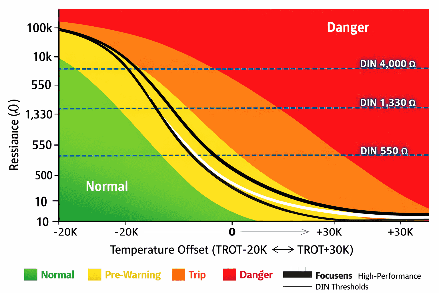 • Critical resistance thresholds: <550Ω at TROT-5K, >1,330Ω at TROT+5K, >4,000Ω at TROT+15K per DIN VDE V 0898-1-401:2020