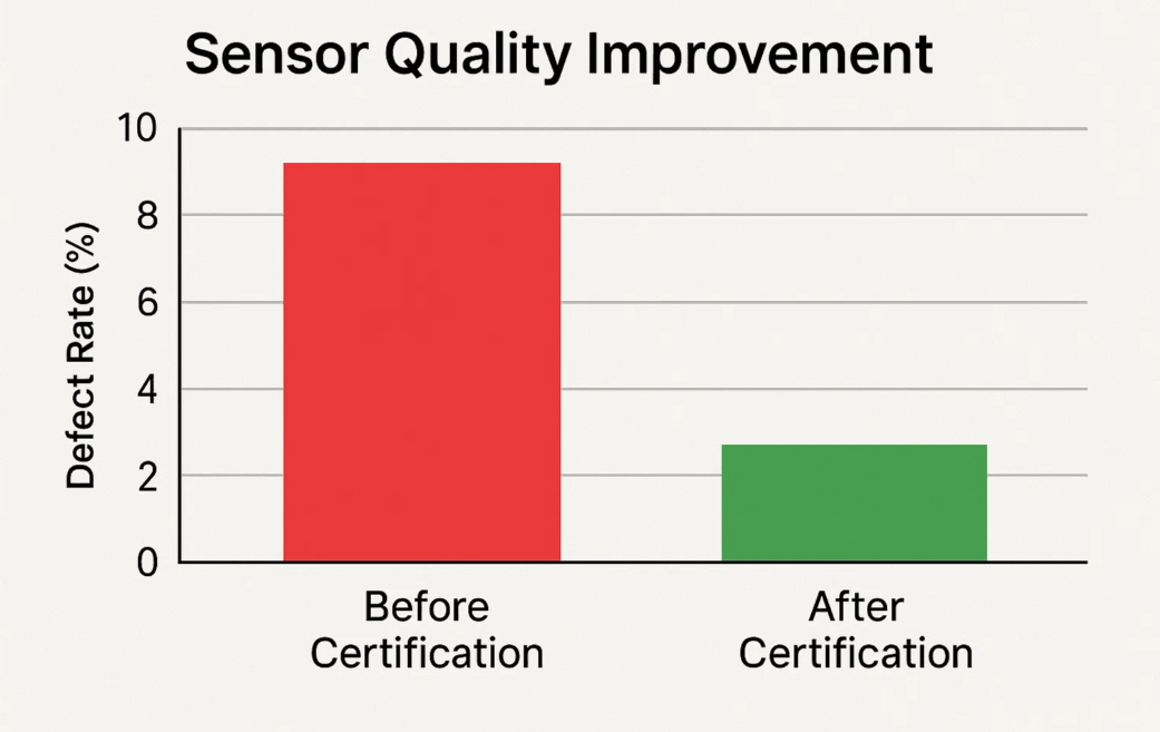 Bar chart showing reduction in defect rates of Focusens temperature sensors after IATF 16949 certification